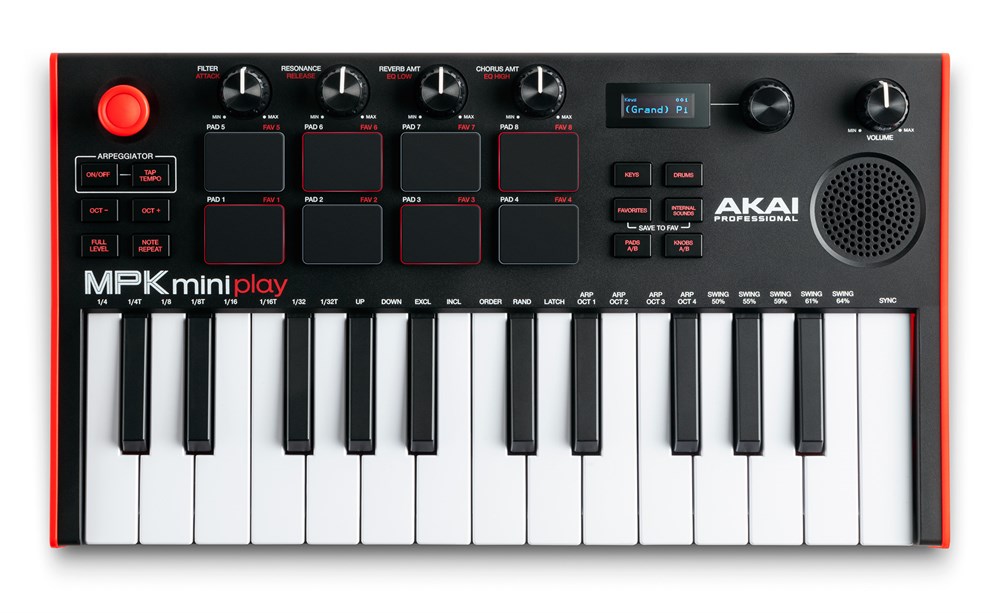 AKAI PRO MPK MINI PLAY MK3 Портативная MIDI-клавиатура со встроенным динамиком дополнена 10 ударными и 128 инструментальными звуками, имеет 25 чувствительных клавиш и арпеджиатор. Может работать от батареек..