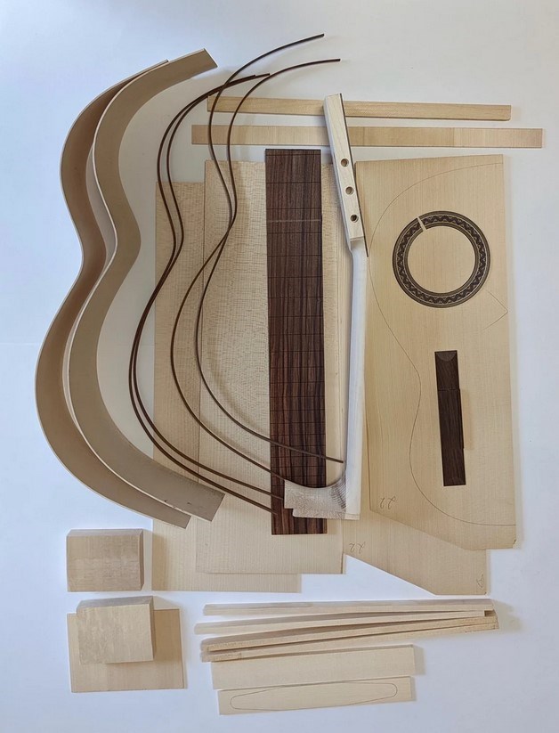- В набор входят согнутые обечайки, деки из двух половинок, а также все остальные необходимые детали: