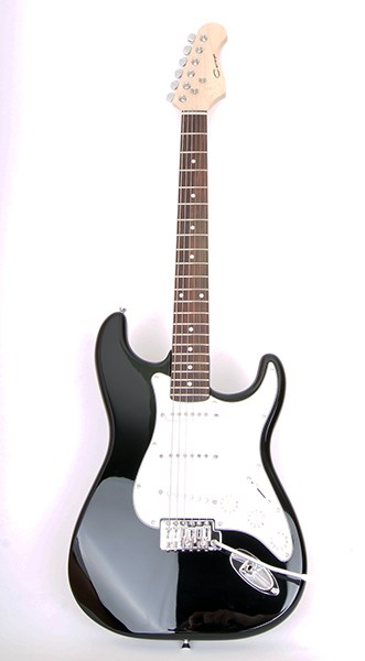 E200BK Электрогитара SSS Caraya. Мензура 648мм, корпус - древесина твердых пород, гриф - клен, накладка грифа - палисандр, 1 громкость, 2 тона, 5-позиционный переключатель, защитная накладка - белая, цвет - черный, бридж - тремоло, Caraya Шестиструнная электрогитара черного цвета.