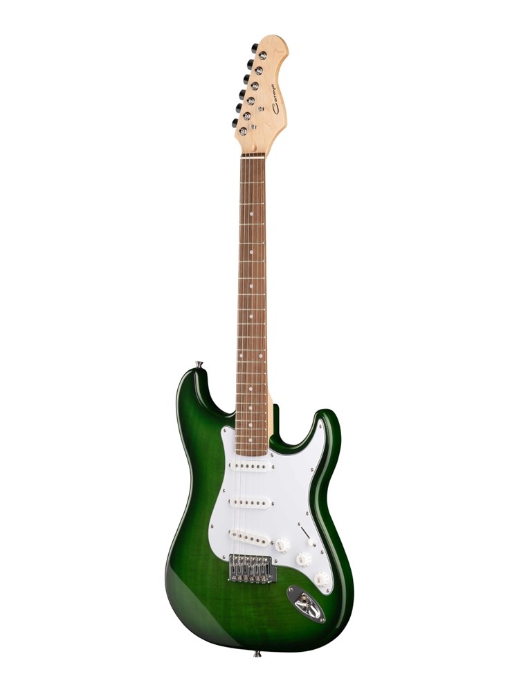 E200TGR Электрогитара, Caraya Шестиструнная электрогитара зелёного цвета. Корпус гитары типа «Stratocaster» изготовлен из древесины твердых пород и имеет защитную пластину белого цвета.