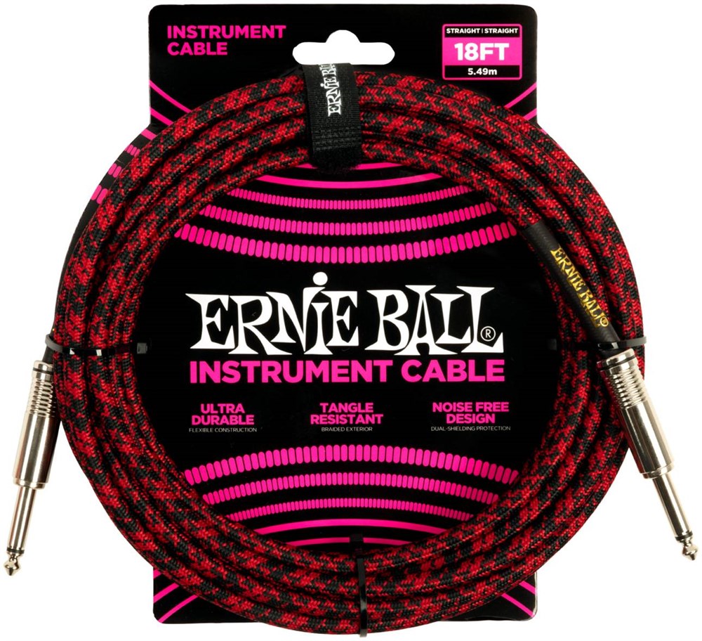 ERNIE BALL 6396 - кабель инструментальный, оплетёный, 5,49 м, прямые джеки, красный/черный