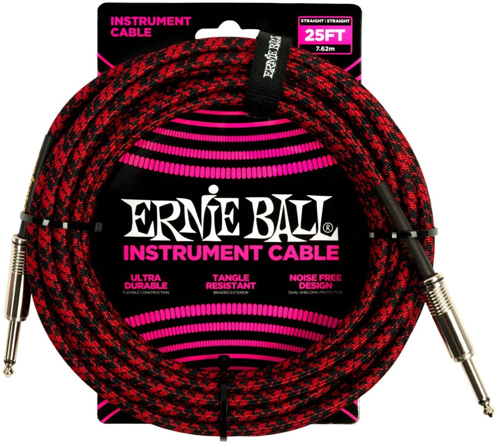 ERNIE BALL 6398 - инструментальный кабель в тканевой оплетке с прямыми джеками, длина 7,62 метра, цвет черный с красным.