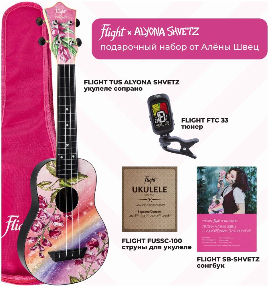 FLIGHT ALYONA SHVETZ PACK 2 - подарочный набор от Алены Швец: укулеле, струны, тюнер, сонгбук