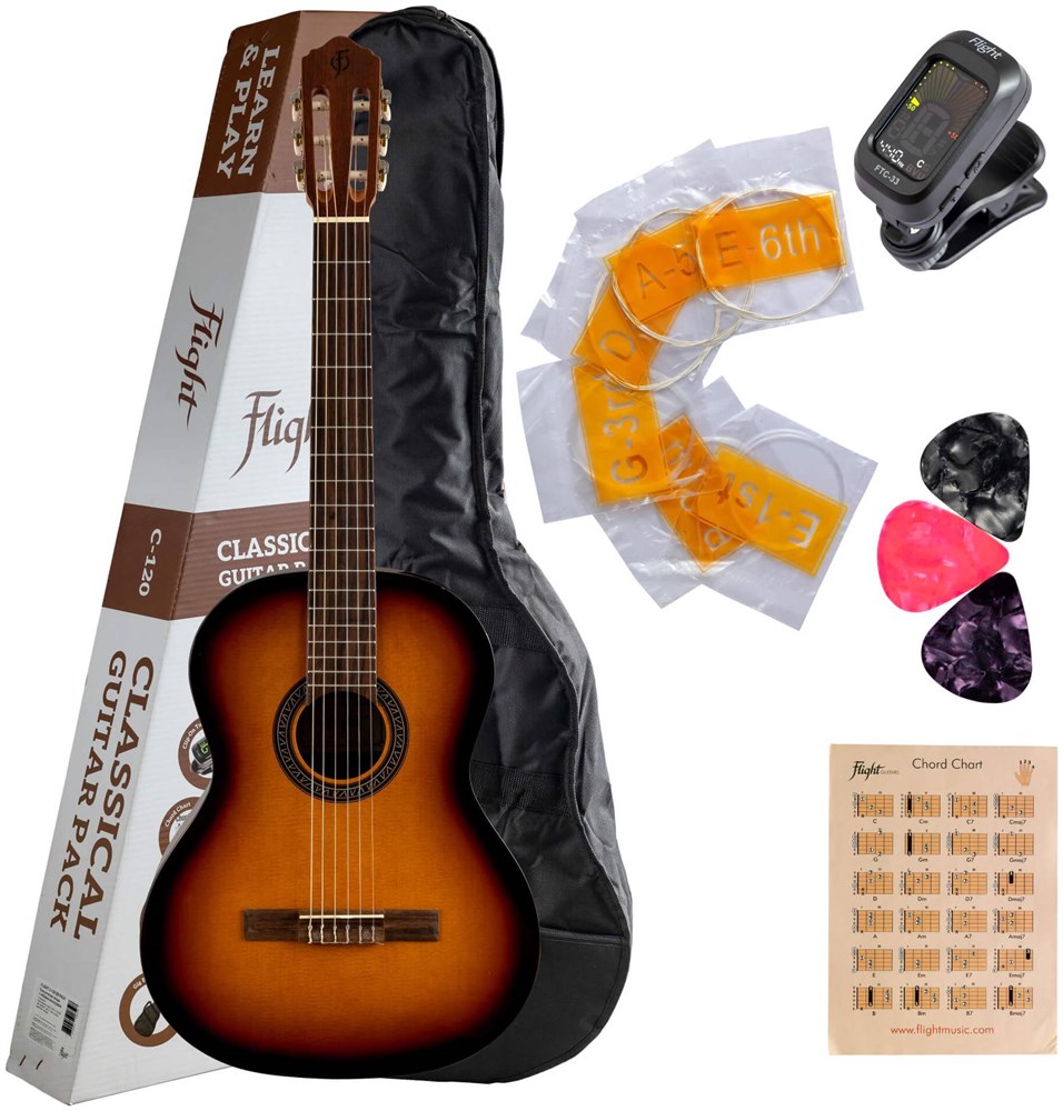 FLIGHT C-120 SB PACK – это комплект с классической гитарой цвета санберст и набором необходимых аксессуаров.