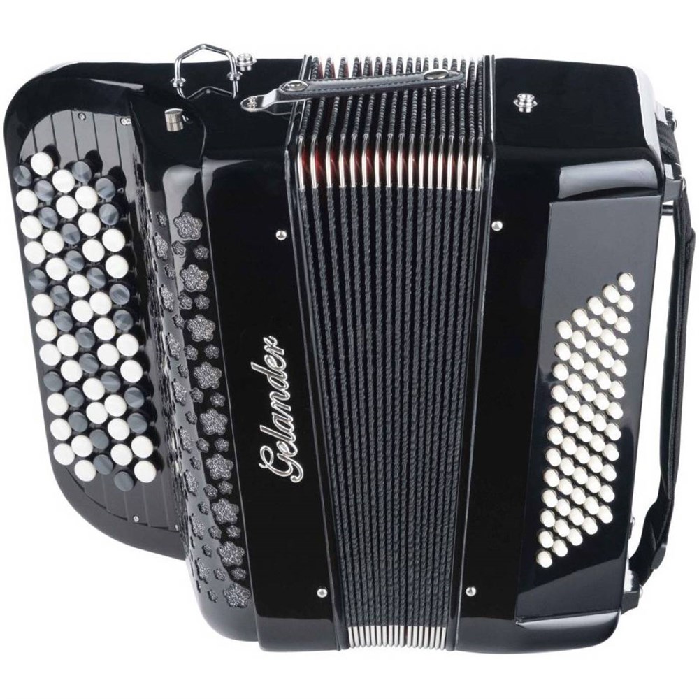 Кнопочный аккордеон ученический Чехол и ремни в комплекте GELANDER GH5060B-BK - кнопочный аккордеон, в правой руке - 62 кнопки, 2 голоса, в левой - 60 басов.