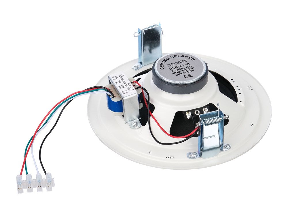 HSR163 — это потолочный динамик со встроенным трансформатором 70/100 В. Технология 70/100 В снижает потери в линии на больших расстояниях и позволяет параллельно подключать несколько громкоговорителей.