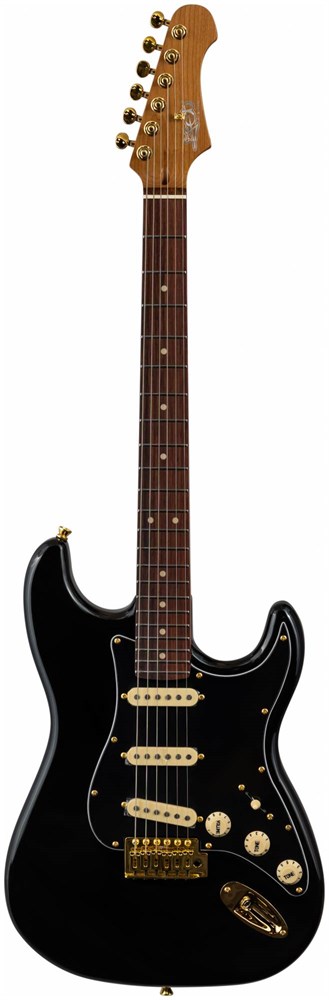 Накладка на гриф выполнена из палисандра с винтажными маркерами Clay Dots, локовые колки, золотая фурнитура и тремоло, звукосниматели SSS Alnico кремового цвета, черная накладка и ручки управления кремового цвета – в JET JS-380 BK G все продумано до мелочей.