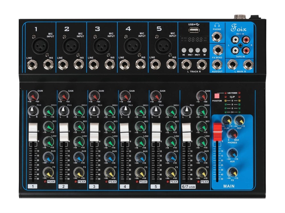 7-канальный микшерный пульт с двумя стереоканалами и отдельным стереоканалом магнитофона. Отдельные элементы управления входным разъемом JACK для микрофонного и линейного входов.