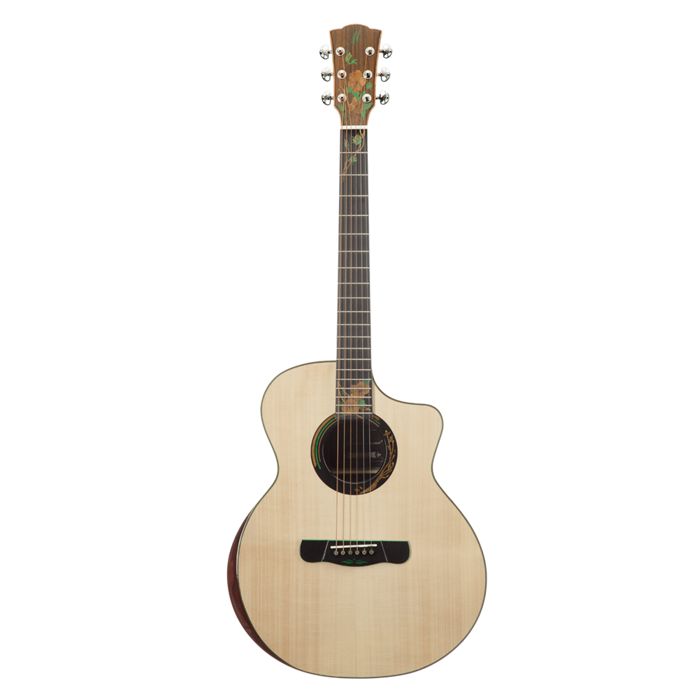 - Инкрустация: вставки ручной работы из разных пород дерева и перламутра на голове грифа, накладке, розетке и нижней деке