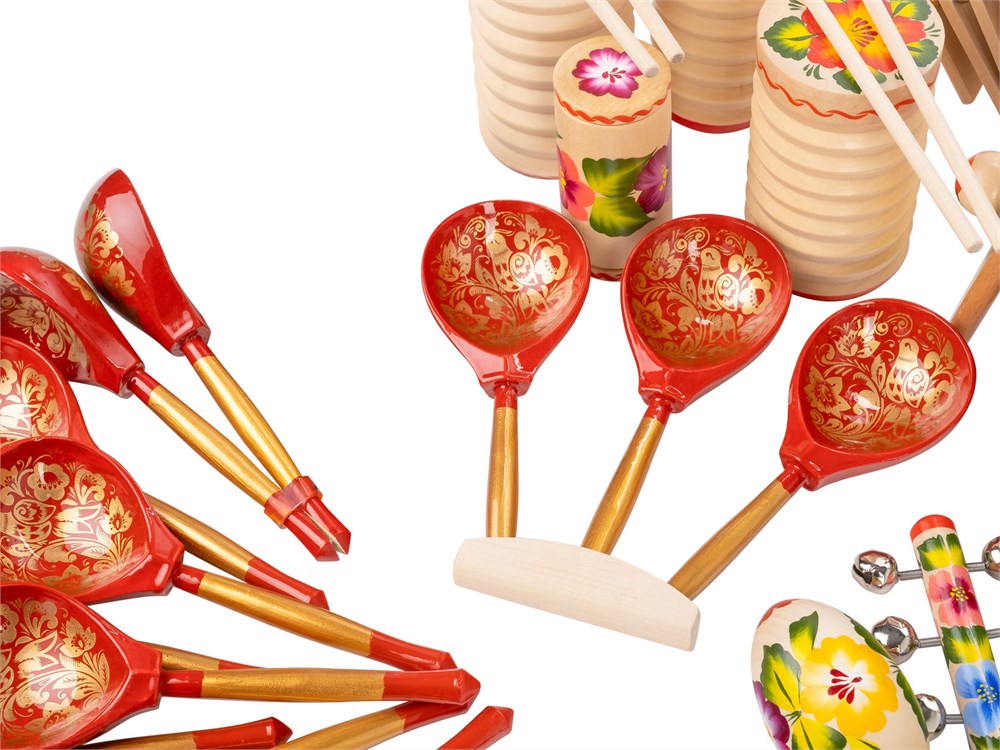 Комплект «Русский праздник» рассчитан на большой взрослый или детский ансамбль. В этом наборе представлены все шумовые и духовые инструменты, разработанные в «Мастерской Сереброва» для детских садов.