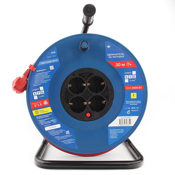 PC20501 PowerCube Удлинитель на катушке 16А/3,5 кВт, 3х1,5мм2, 30м, 4 розетки с заземлением, Электрическая мануфактура Силовой удлинитель на пластиковой катушке. Предназначен для использования на садовых участках, в мастерских и подсобных хозяйствах.