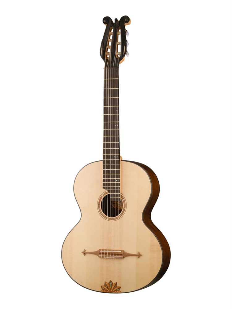 Голова грифа выполнена в виде лиры, материал черное дерево. Классическое крепление струн..