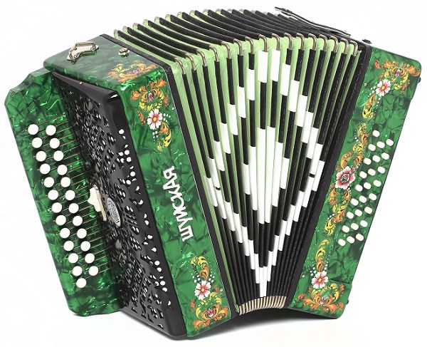 Настройка - в розлив (аккордеонное звучание). Регистр имеет два положения: левая – двухрядная, кнопочная (25 кнопок).