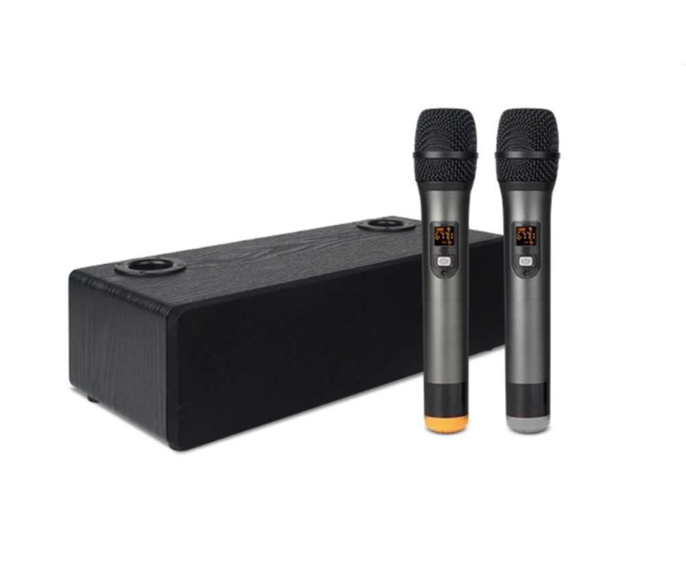 Два беспроводных микрофона в комплекте. Линейный вход RCA.