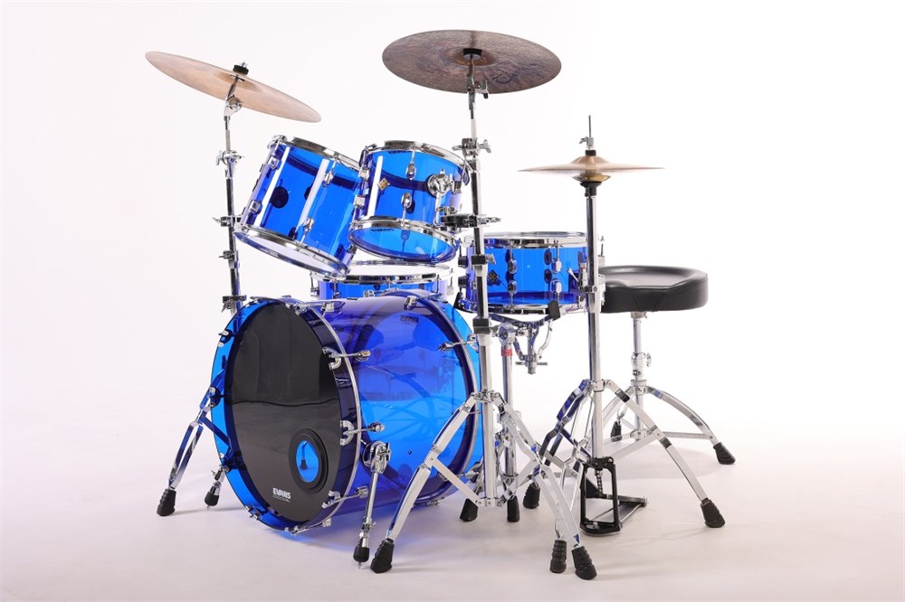 Барабанная установка из акрила. Состав: бас-барабан - 22"х16", напольный том - 16"х14", альт том 12"х9" , альт том 10"х8", малый барабан 14"х7".