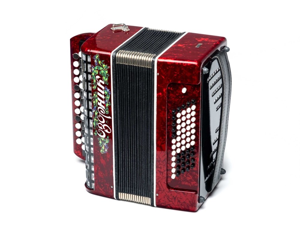 Правая– пуговичная, имеет 37 клавиш (тонов и полутонов) расположенных на грифе в три ряда.