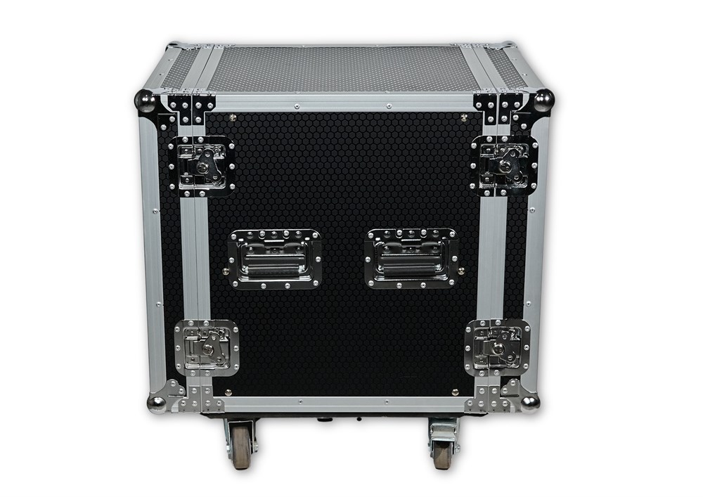 RMW-12U Кейс Рэковый 12U деревянный; ламинированная фанера 9мм; глубина 500мм; две крышки; 8 замков-бабочек; 4 врезные ручки; 4 бесшумных колеса 3", 2 тормоза, рэковые направляющие с фронтальной и тыльной стороны.