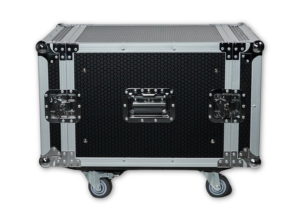 RMW-8U Кейс Рэковый 8U деревянный; ламинированная фанера 9мм; глубина 500мм; две крышки; 8 замков-бабочек; 4 врезные ручки; 4 бесшумных колеса 3", 2 тормоза, рэковые направляющие с фронтальной и тыльной стороны.