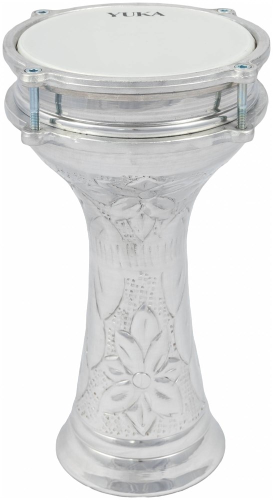 YUKA DRBTG6-12 M Турецкая дарбука размера 6' x 12' сделана из алюминия и имеет мембрану из пластика, в связи с чем она имеет легкий вес и позволяет использовать барабан на улице, не боясь дождя и даже снега. Таким образом, эта дарбука – идеальный походный вариант обладающий полным пространным звуком и легкостью конструкции. А корпус с выкованым вручную арабским рисунком, придает инструменту особый вид.