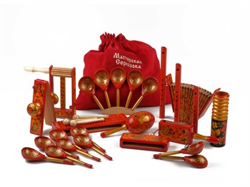 Комплект ''Скоморох'' рассчитан на средний и большой народный ансамбль. В этом наборе представлены все основные шумовые инструменты, разработанные в Мастерской Сереброва для профессиональных взрослых и детских народных коллективов.